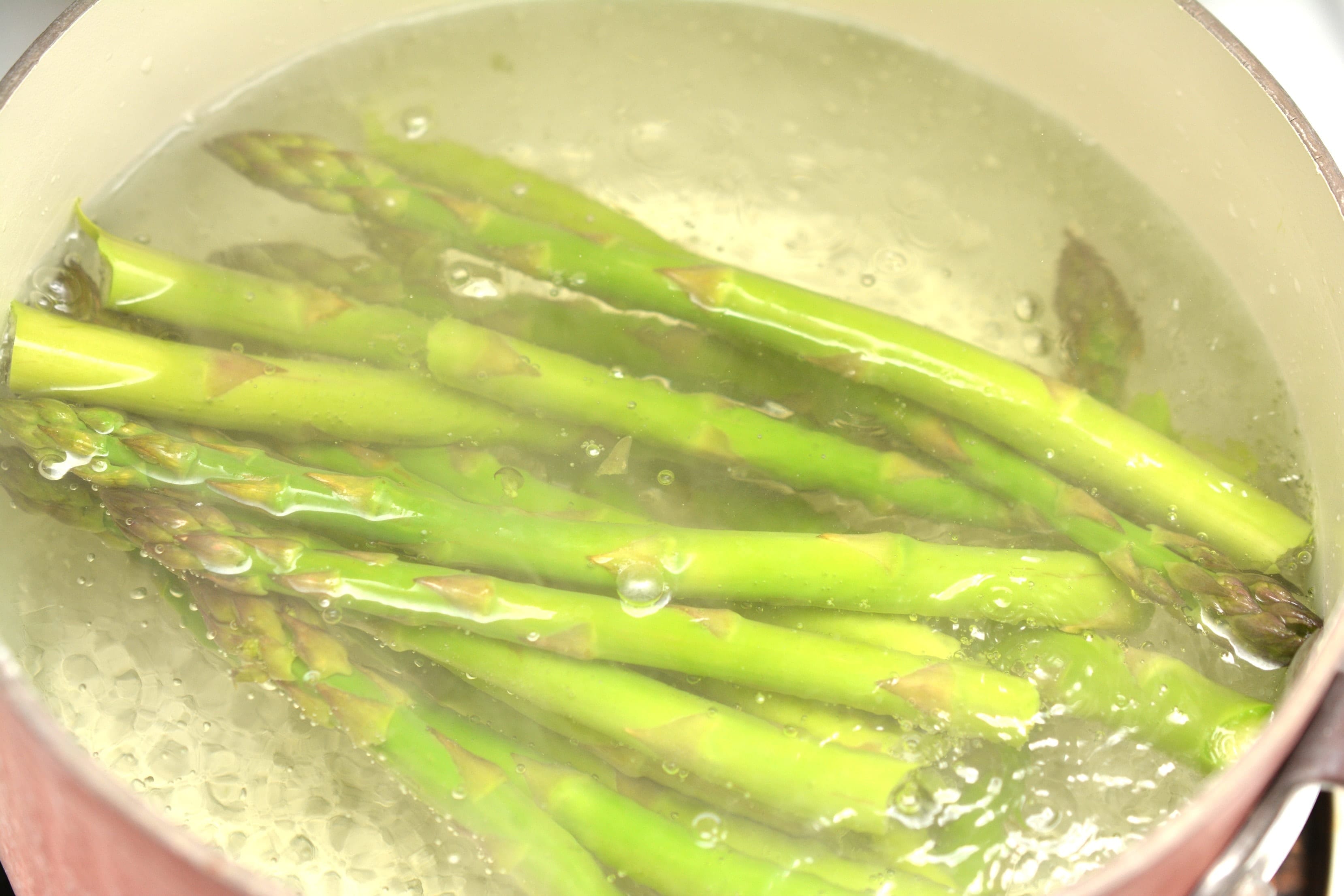- Place the asparagus into the boiling water, and cook for 2-3 minutes until a crisp tender.