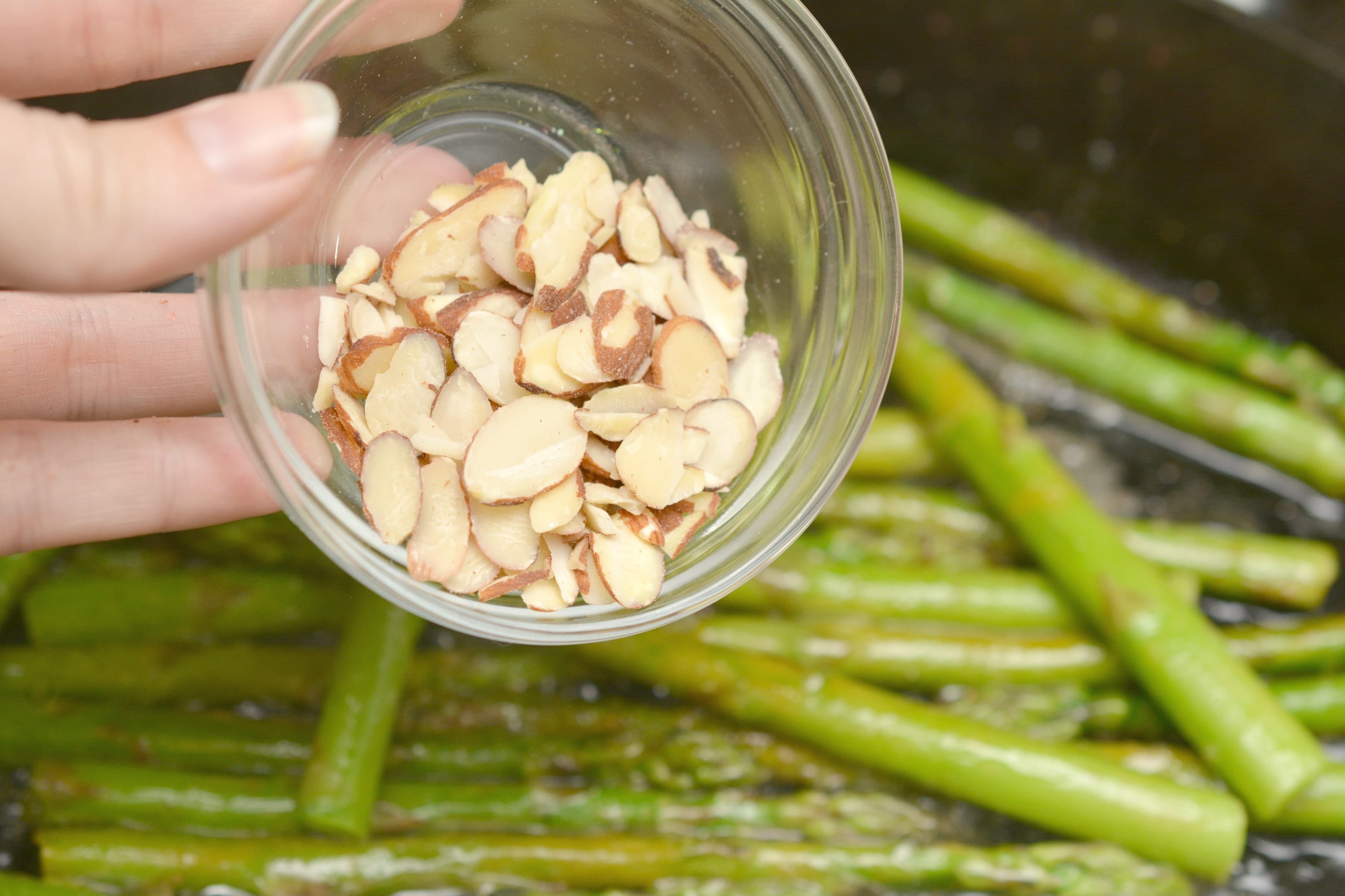 Sliced almonds are what is recommended for this asparagus almondine recipe. If you have whole almond, you can place them in a bag and chop them up using a rolling pin. You just don’t want to toss whole almonds on top of your asparagus.