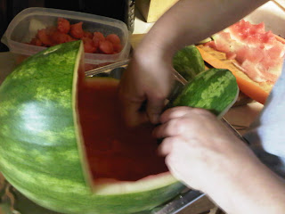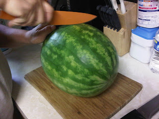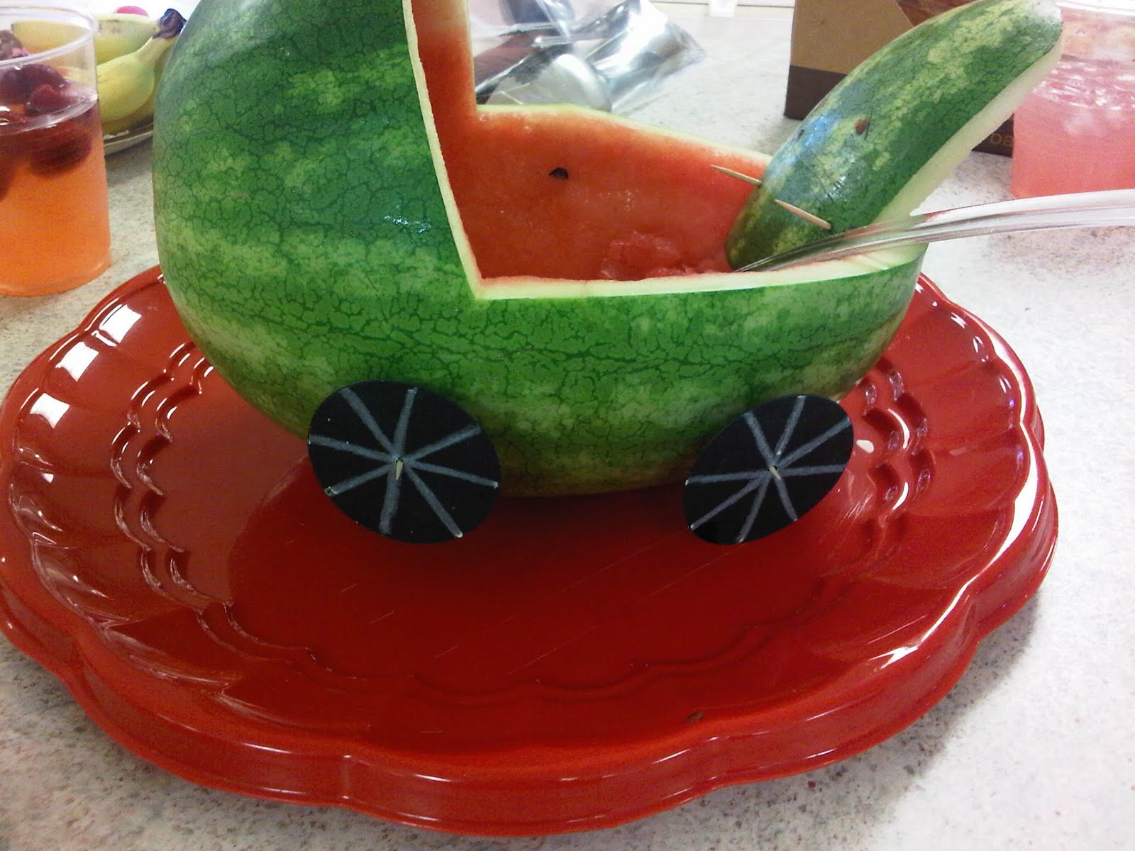 Saturday – Ryley’s dance class, grocery shopping for two parties, started a baby shower gift, made a baby carriage out of a watermelon (see below), cleaned our house and cooked birthday dinner for friends (pics to come)