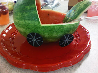 I was in charge of the fruit for the baby shower. I didnt want any plan ole fruit tray, so I headed over to my trusty friend pinterest and found a tutorial for a baby carriage watermelon bowl. Yes please! Wanna know how easy this was? Check it out..