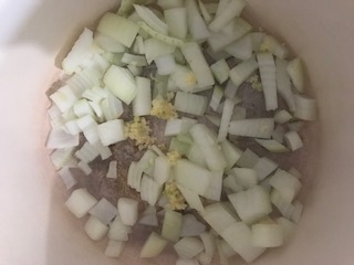 - In a large pot or skillet, add the butter, onion and garlic. Allow to cook for 5 minutes, or until the onion is translucent and fragrant.