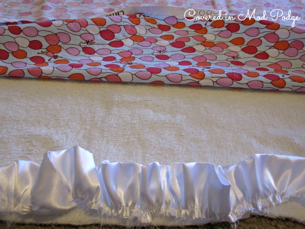 I worked in small sections at a time to add in the ruffle and pin. Fold up a bit of your quilting cotton and lay your ruffle on top of your minky. The seam of the satin should be lined up with the edge of your fabrics. Now pin like you’ve never pinned before.