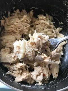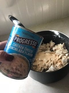 Once you have all your ingredients you are going to start by boiling and shredding your chicken. Or you can make shredded chicken in your crock pot during the day and the enchiladas in the evening. To your shredded chicken you are going to add 1/4 cup of chicken cheese enchilada flavored soup and shredded cheese. Mix to combine.