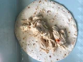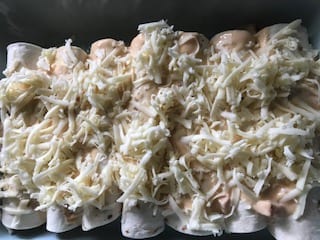 Then you add a few tablespoons of chicken to your tortillas and roll them up. Place them seem side down in a 9×13 casserole dish. Add another 1/4 cup of the soup on top of the tortillas and then more cheese.