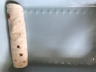 - Lay a tortilla flat and add a tablespoon or two of the filling. Roll up and lay seam side down in a baking dish.