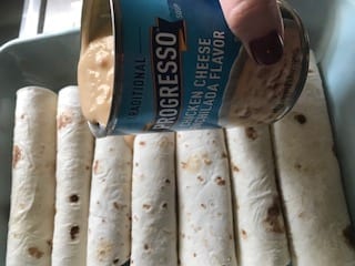 To make these enchiladas extra creamy I used Progresso chicken cheese enchilada flavored soup inside and on top of the enchiladas. You only need 1/2 cup of the soup total.