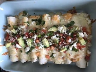 The fun part is that you can get creative with your enchilada toppings. I like pico de gallo, extra cilantro, crumbly cheese and avocado on mine. You can also add guacamole, sour cream or even bacon!