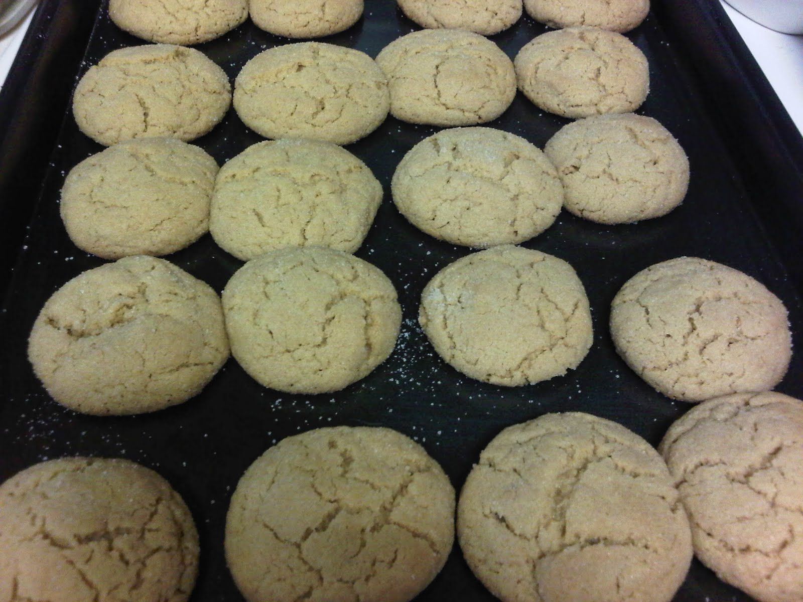 Take your dough and roll them into balls. Take your balls (insert high school girl giggle here) and roll them in the sugar. Place them on the cookie sheet and bake for 10 minutes.