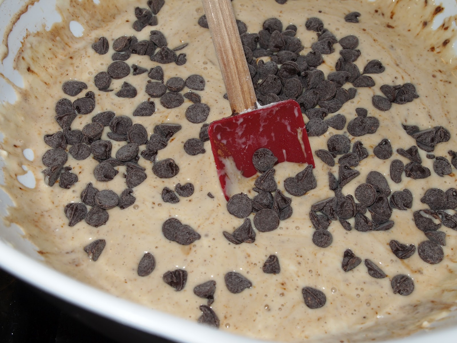 Add your chocolate chips and mix it all up. [This is my favorite part.. I heart chocolate. We have a very close relationship.] Yes, you can eat a few chips too. [That’s one of the best parts!]