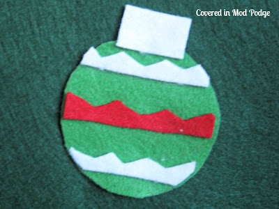 Almost done! It’s time to go nuts making ornaments. I used various sized cups and bowls to draw the circles onto my felt. I also cut small rectangles to look like ornament tops. Be sure to use either a marker close to the color of the felt or a disappearing ink pen. If you create decorations for the ornaments, hot glue them on.