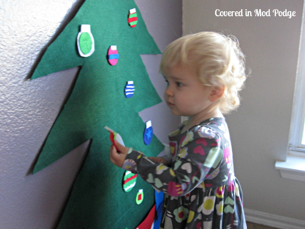I still wanted something festive in our living room. Hence, this felt tree. Felt sticks to itself. Emma can go nuts decorating and redecorating the tree. I’m hoping she’ll play with it over and over again!