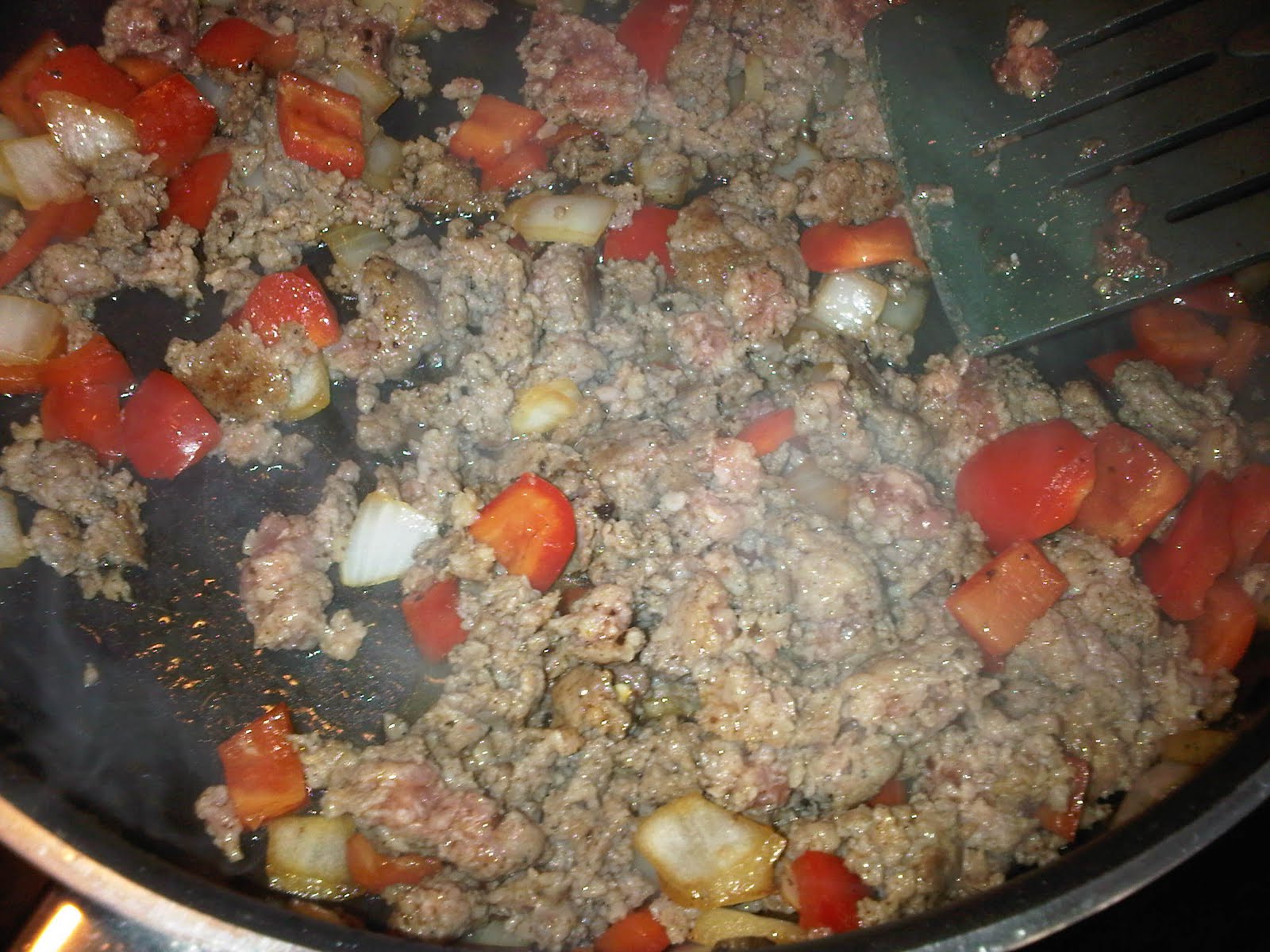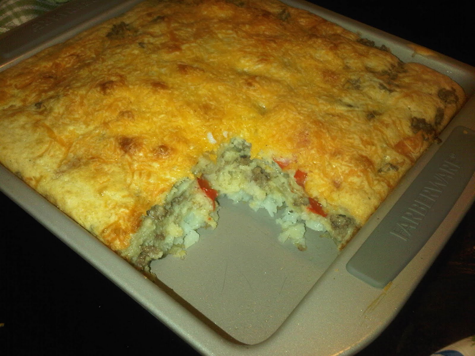 Brown the peppers, onions and sausage. Add them to the Bisquick mix.