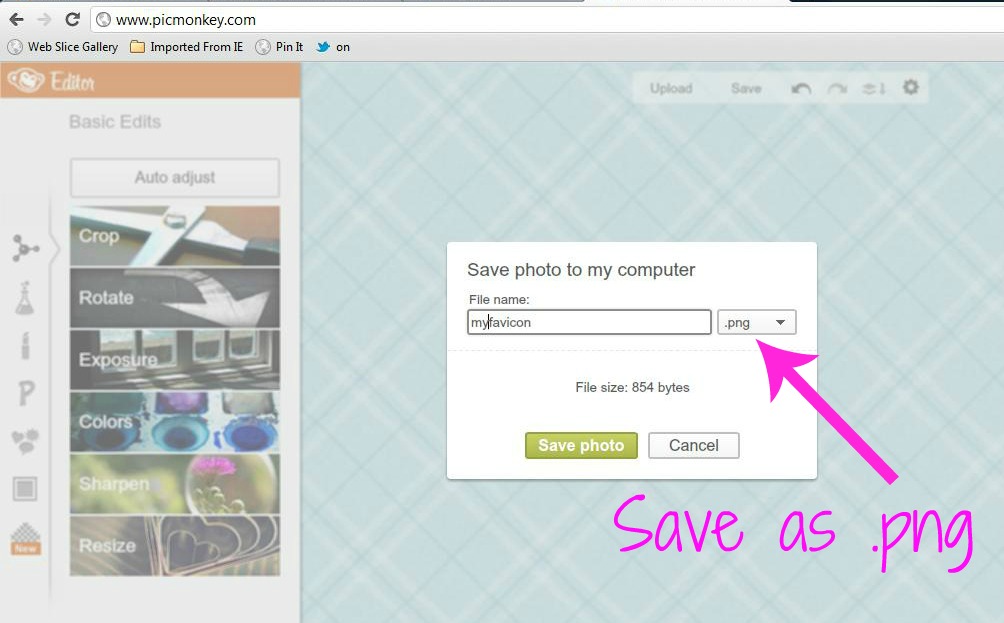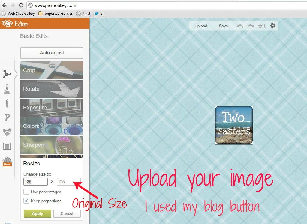 Step 1: Open up PicMonkey and upload an image (in my case, my blog button).
