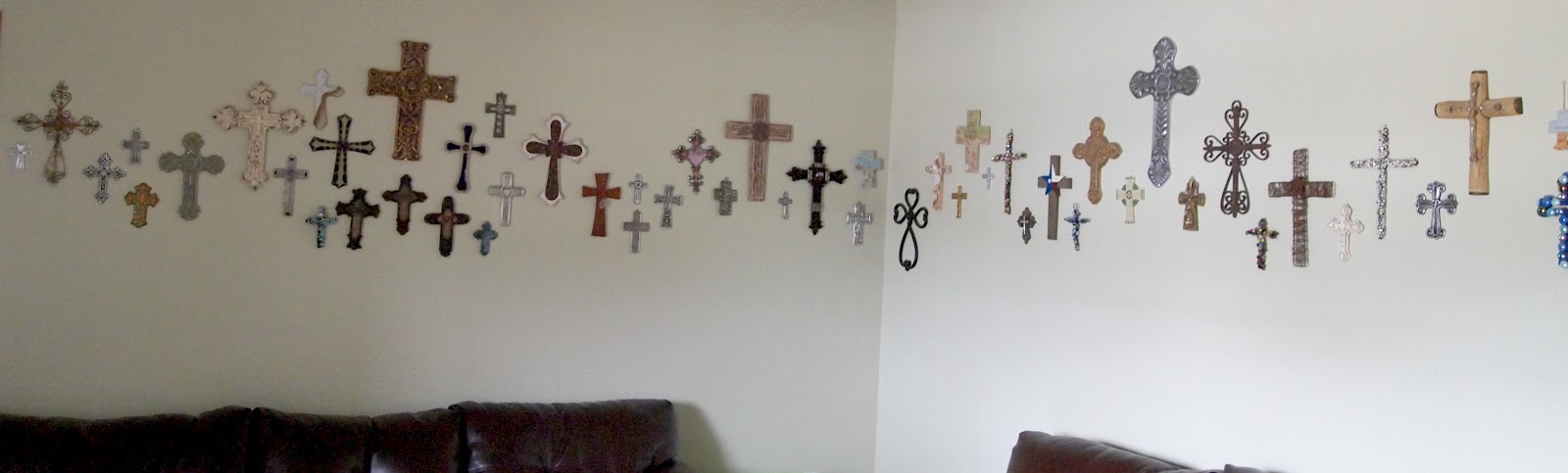 This is the main wall of the living room. I have been collecting crosses for almost ten years now. Each one is special to me and reminds me of an important time in my life.. although they all special since they represent Jesus dying for our sins. [Got serious about my faith there.]