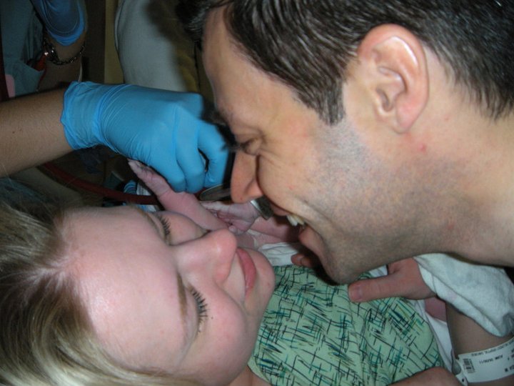 This happy face quickly changed. After a few hours of being on pitocin things got bad and I mean really bad. My contractions started to over take me. My water ended up breaking on it’s own which was good {I had thought I peed myself}. I was going back and forth from the labor ball to sitting on the toilet since these seemed to be the only two places where I could tolerate my contractions. Matt was wonderful, supporting and helping me better than I ever expected. The Doulas were great too, helping Matt when he needed it and doing their best to help me tolerate my contractions.