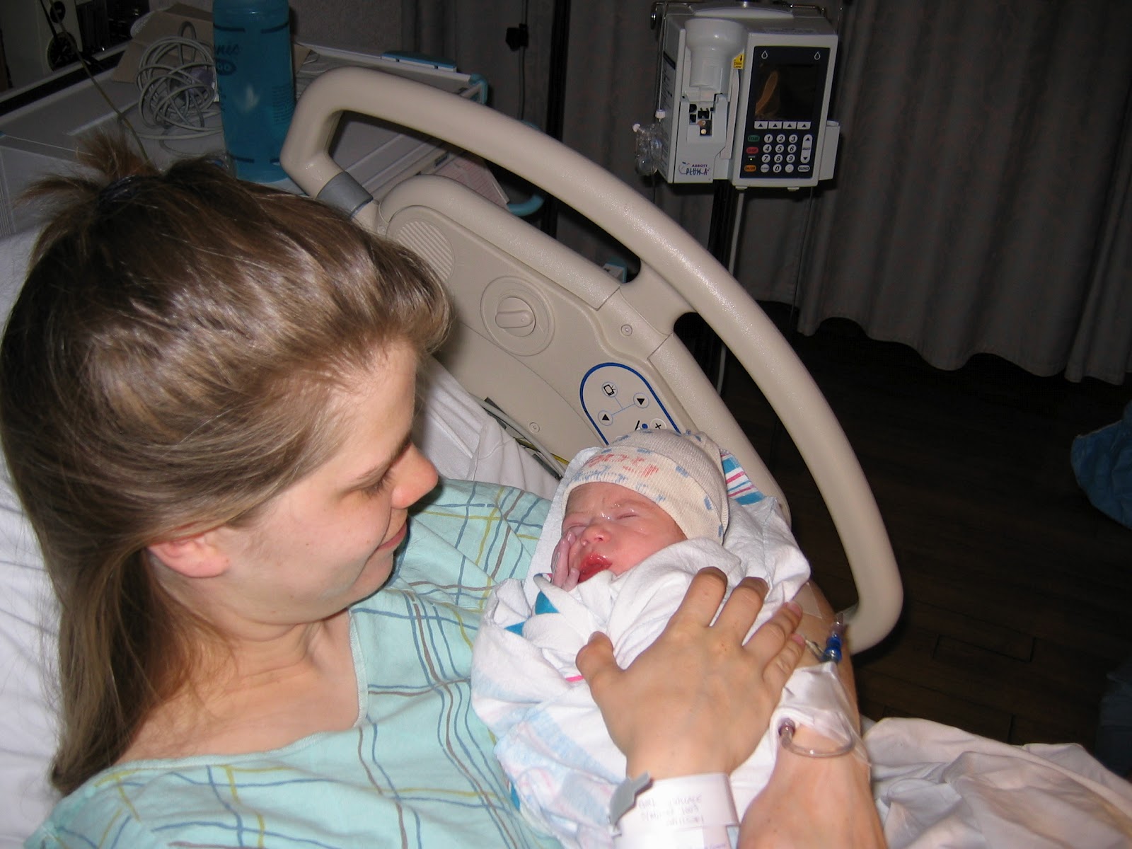 We got to L&D and sure enough my water had broken, but I was still not effaced or dilated. They hooked me up to a fetal heart rate monitor and gave me some Pitocin to speed things along.