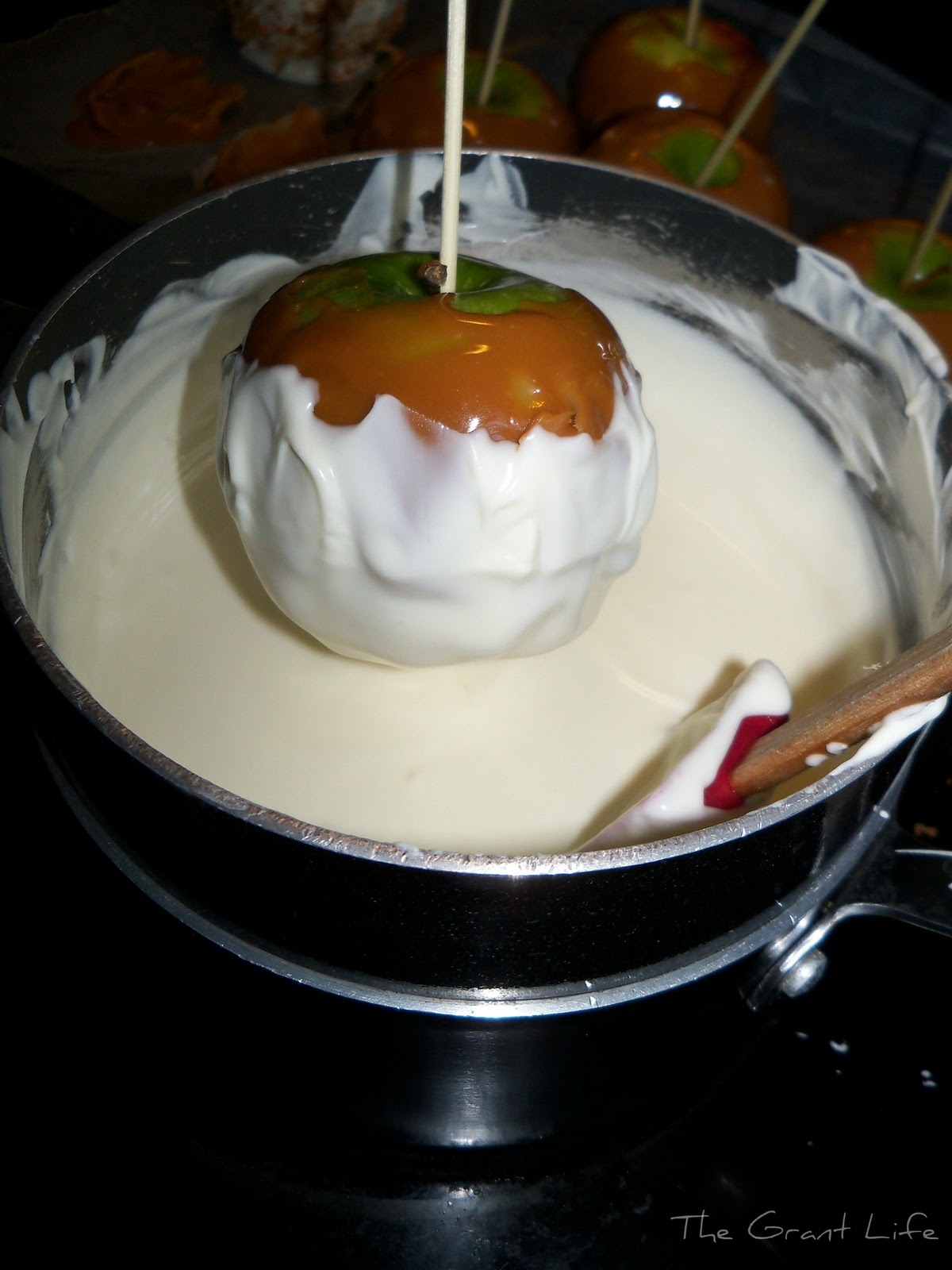 Dip the apple in the chocolate. I spooned it on as well.
