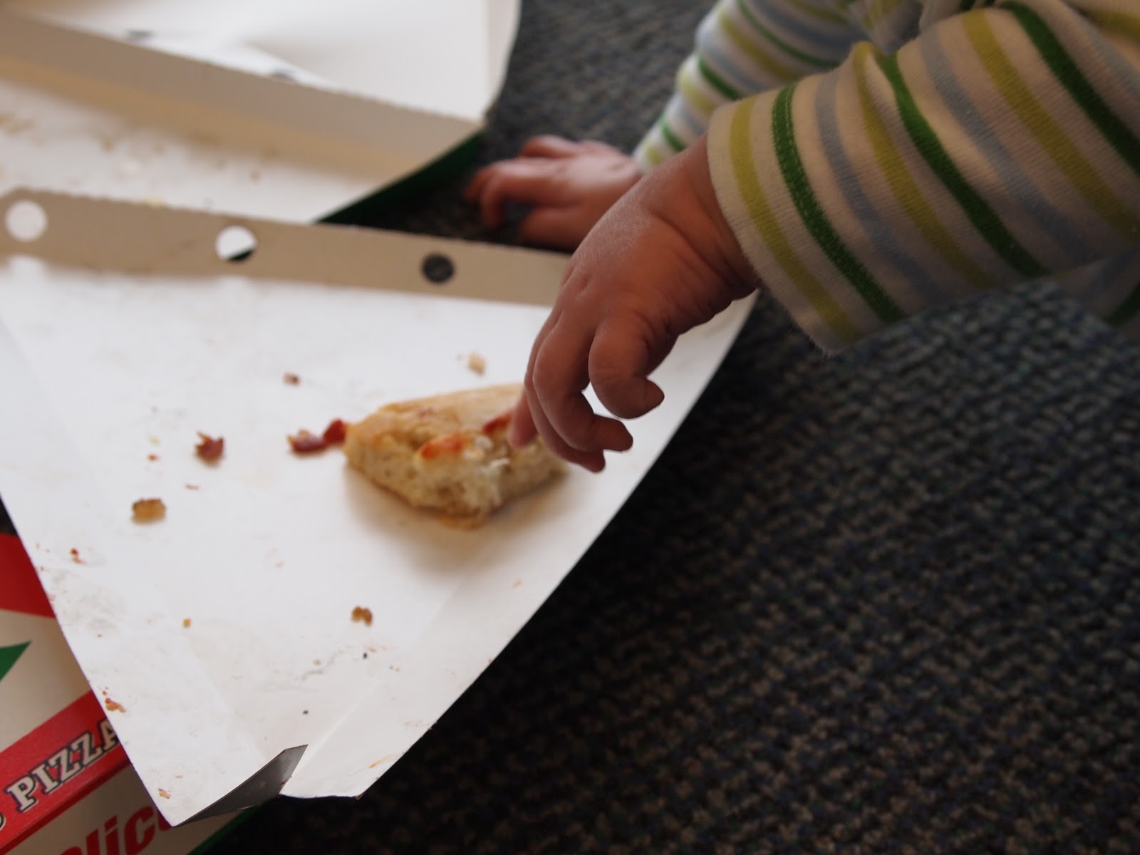 Avery going after our pizza dinner during our 4 hour layover in Cleveland.