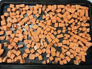 - Bake for 20 minutes and then flip sweet potato cubes, if desired.