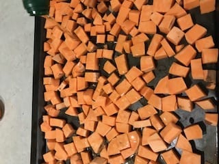 I used olive oil for my roasted sweet potato cubes, but any oil should work. You just need a bit to drizzle over and coat the potatoes.